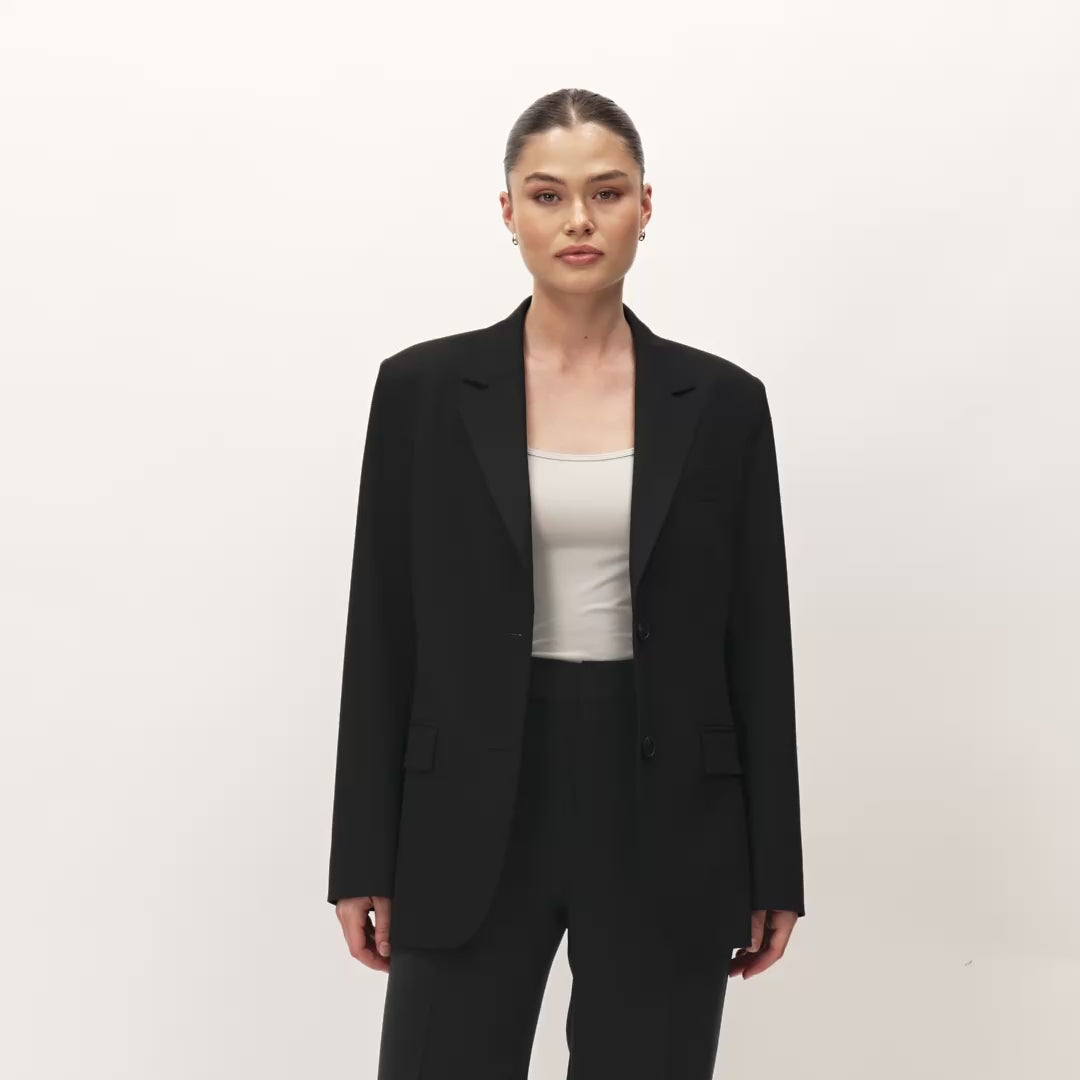Person wearing Ninepine black blazer on a white background